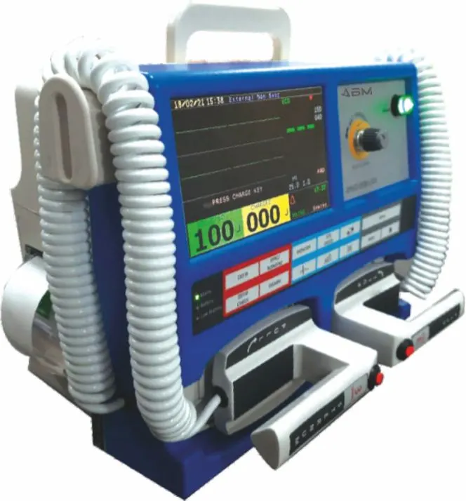 The DF-10 defibrillator features a 7" color display with a built-in printer using 2" thermal paper. It offers variable energy levels from 2 to 200 joules and supports adult and pediatric paddles. With a fast 6-second charge time and battery capacity for 70-100 shocks, it is compact, lightweight, and efficient for emergency use