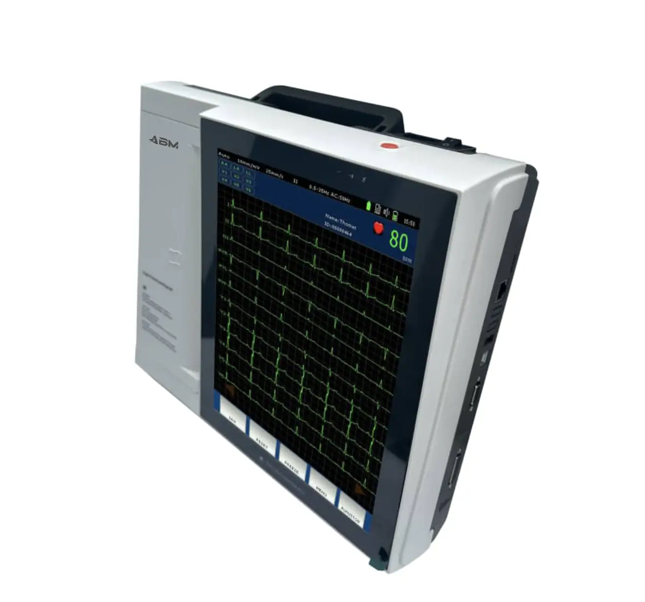 ECG 12I is a portable 12.1" color touchscreen ECG machine with a hidden handle for easy carrying. It can store over 400 ECG reports and connects to a PC via USB, RS232, or optional LAN using ECG workstation software. Powered by a built-in rechargeable Li-ion battery and AC/DC conversion, it supports 100–240V input. With automatic measurement, analysis, and diagnostics, it enhances efficiency and reduces the clinician's workload.
